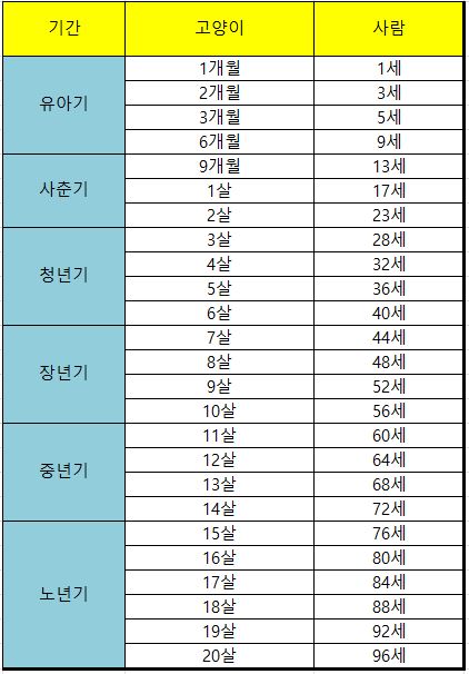 고양이의 나이를 사람 나이로 환산해보면, 고양이 1년은 사람으로 치면 약 17살 정도로 볼 수 있습니다. 이후의 나이는 다음과 같이 계산할 수 있습니다.