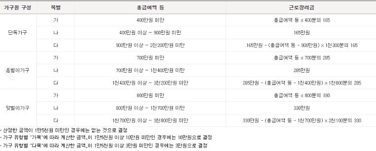 -. 소득이 적어 생활이 어려운 근로자나 사업자 가구를 대상으로 하며, 가구 구성원 수, 근로소득, 사업소득, 종교인 소득에 따라 계산된 금액을 지급하는 제도입니다. 이를 통해 근로를 장려하고 실질적인 소득 지원을 제공합니다.