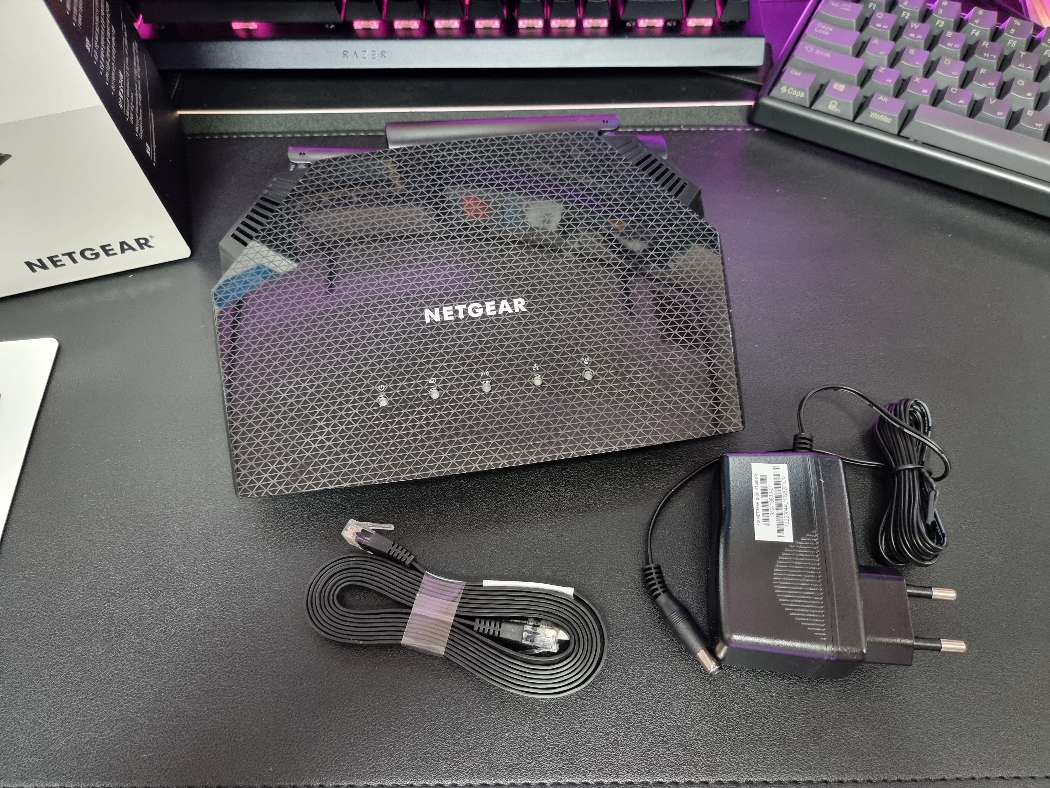 전체 구성품은 넷기어 RAX10, 플렛 타입 랜 케이블, 전원 어댑터가 있습니다.