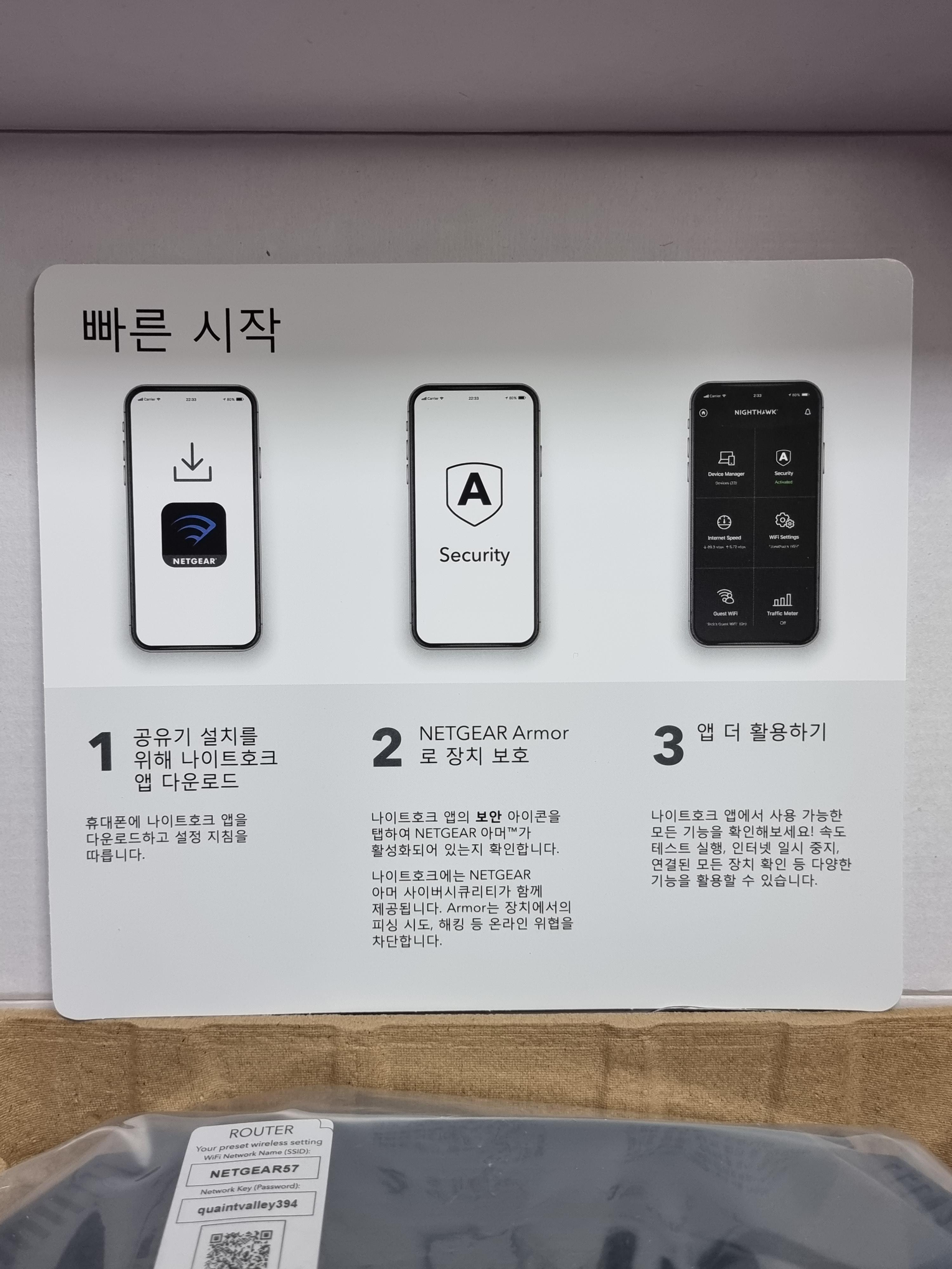 언박싱 해보니 종이 재질의 완충제에 안전 포장되어 있고 넷기어 RAX10 본품과 앱을 활용 설명서가 첨부되어 있습니다.