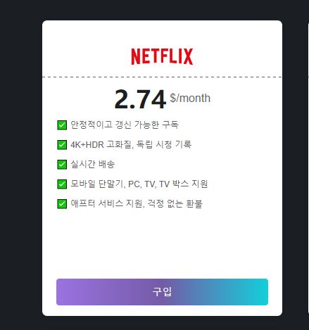 넷플릭스의 경우 1개월 2.74달러 약 3,700원 정도에 사용이 가능합니다. 4K+HDR 고화질이 가능한 상품이라 정말 저렴하지만 좋은 서비스까지 가능합니다.