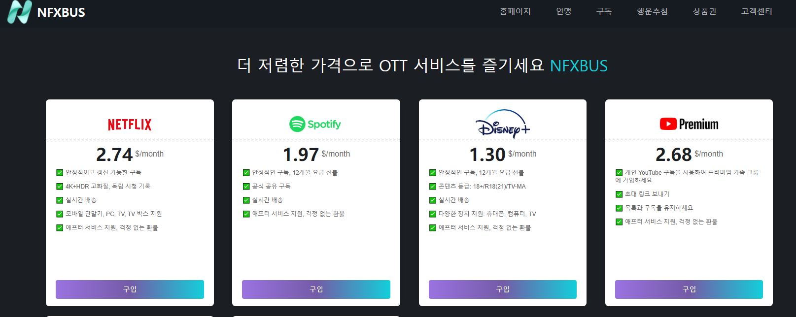 할인 방법은 아래 NFXBUS 사이트에서 구매하는 방법인데요, 저는 이 사이트를 통해 넷플릭스, 유튜브 프리미엄을 아주 저렴하게 계속 사용중에 있습니다.