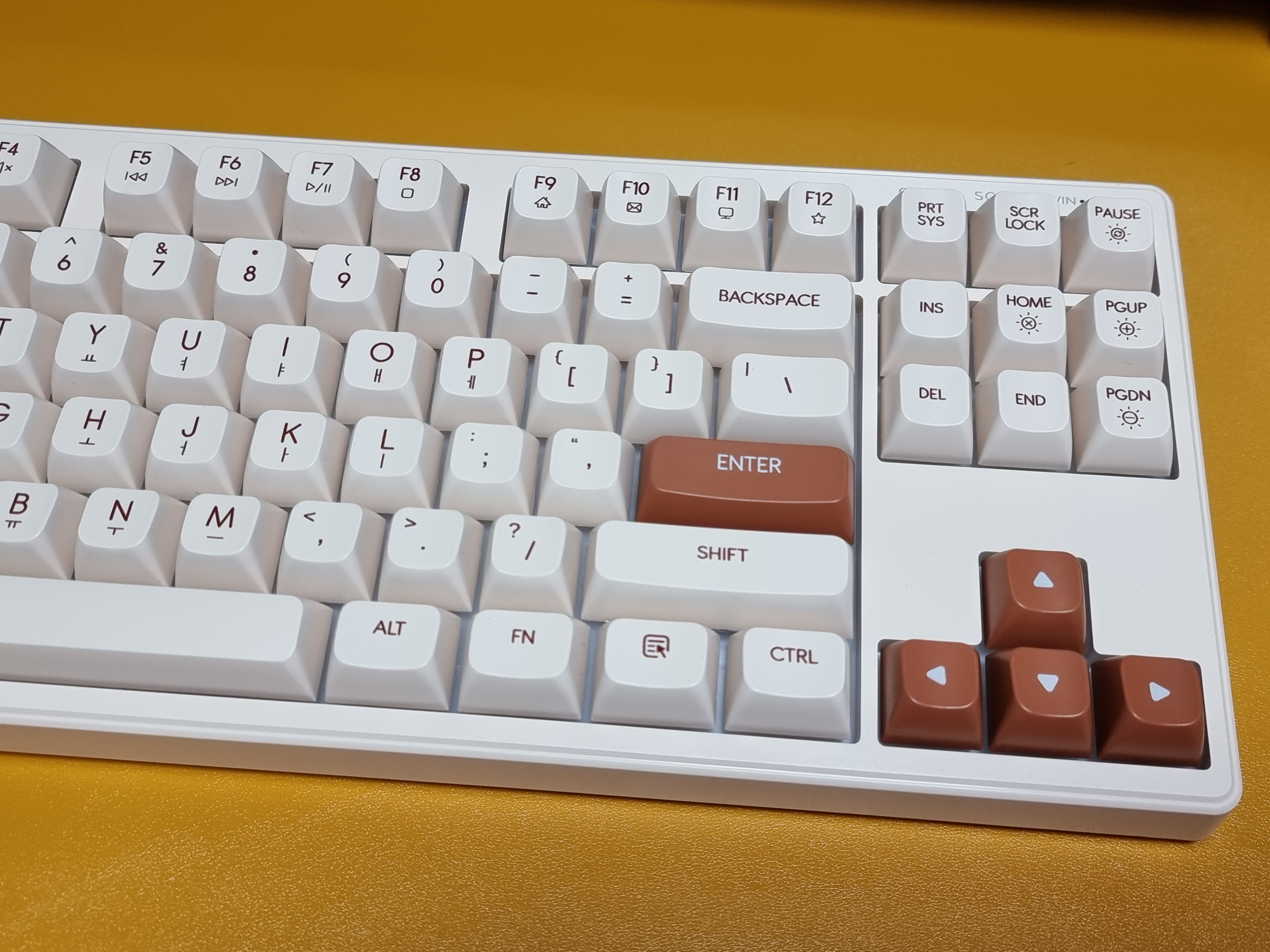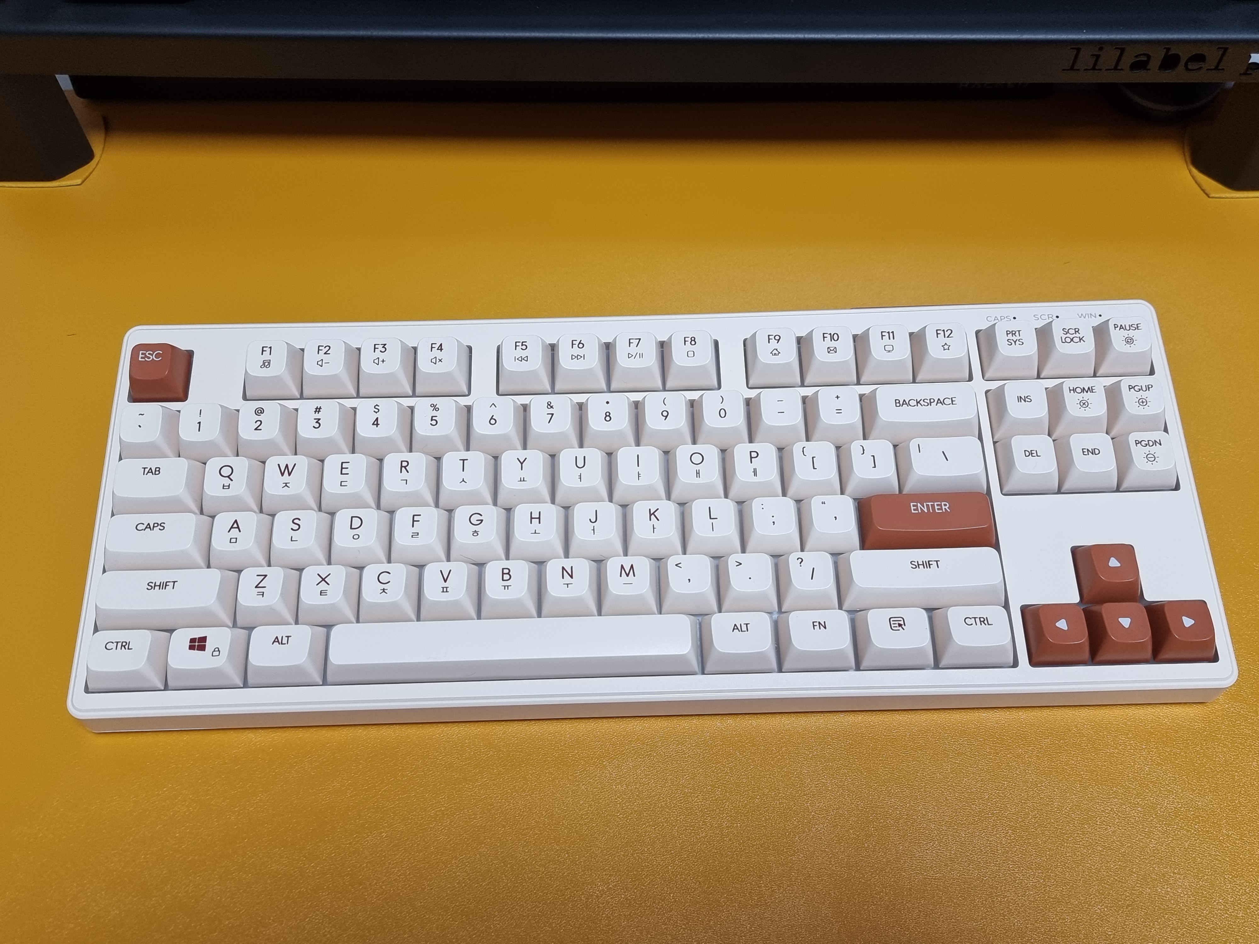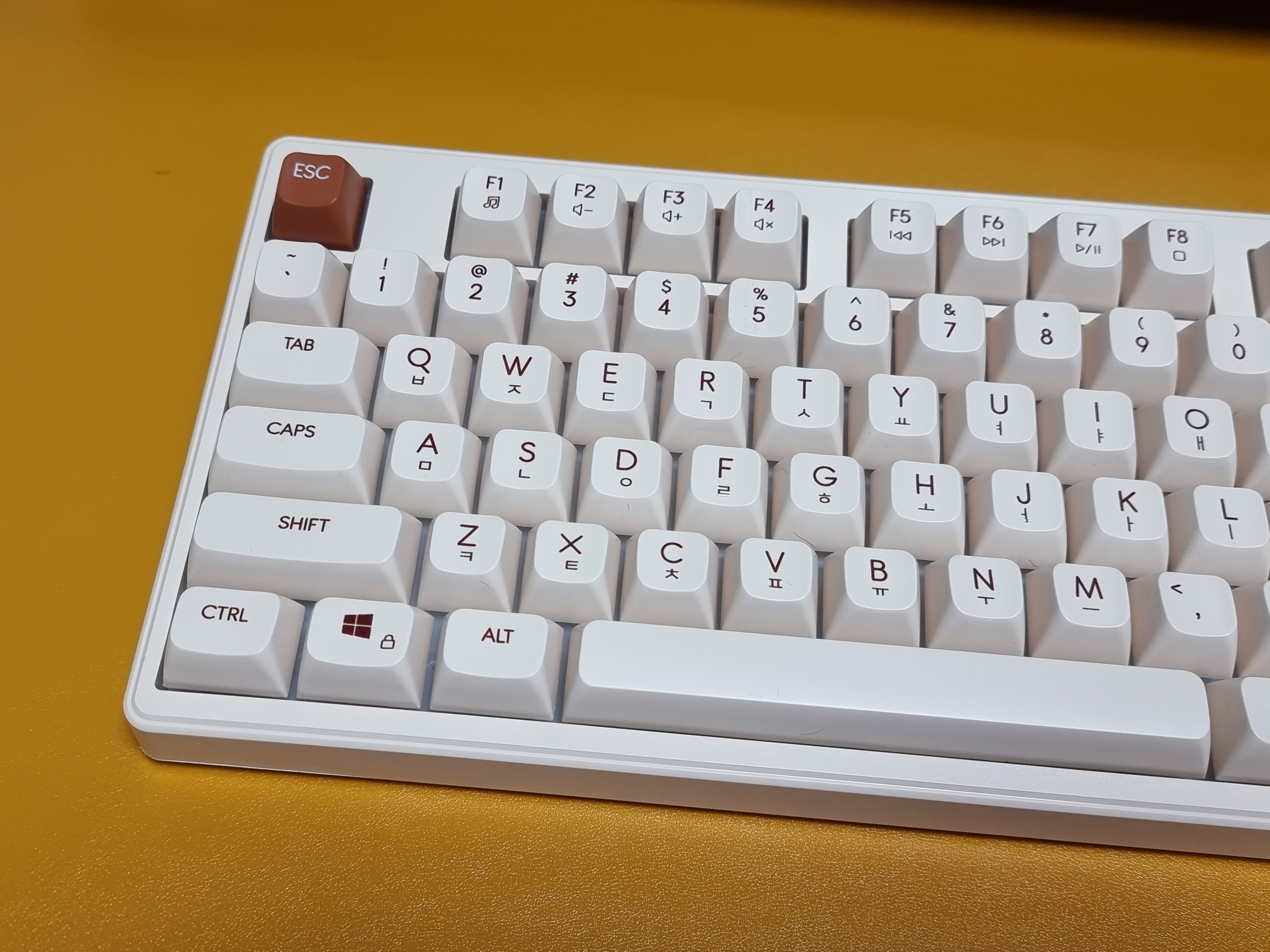키보드의 크기는 363 x 146 x 40mm이며, 87키 텐키리스 배열 레이아웃으로 크기가 작기 때문에 데스크 공간 활용에 장점이 있는 키보드입니다. 색상은 아이보리 색상으로 색감이 아주 예뻤습니다.