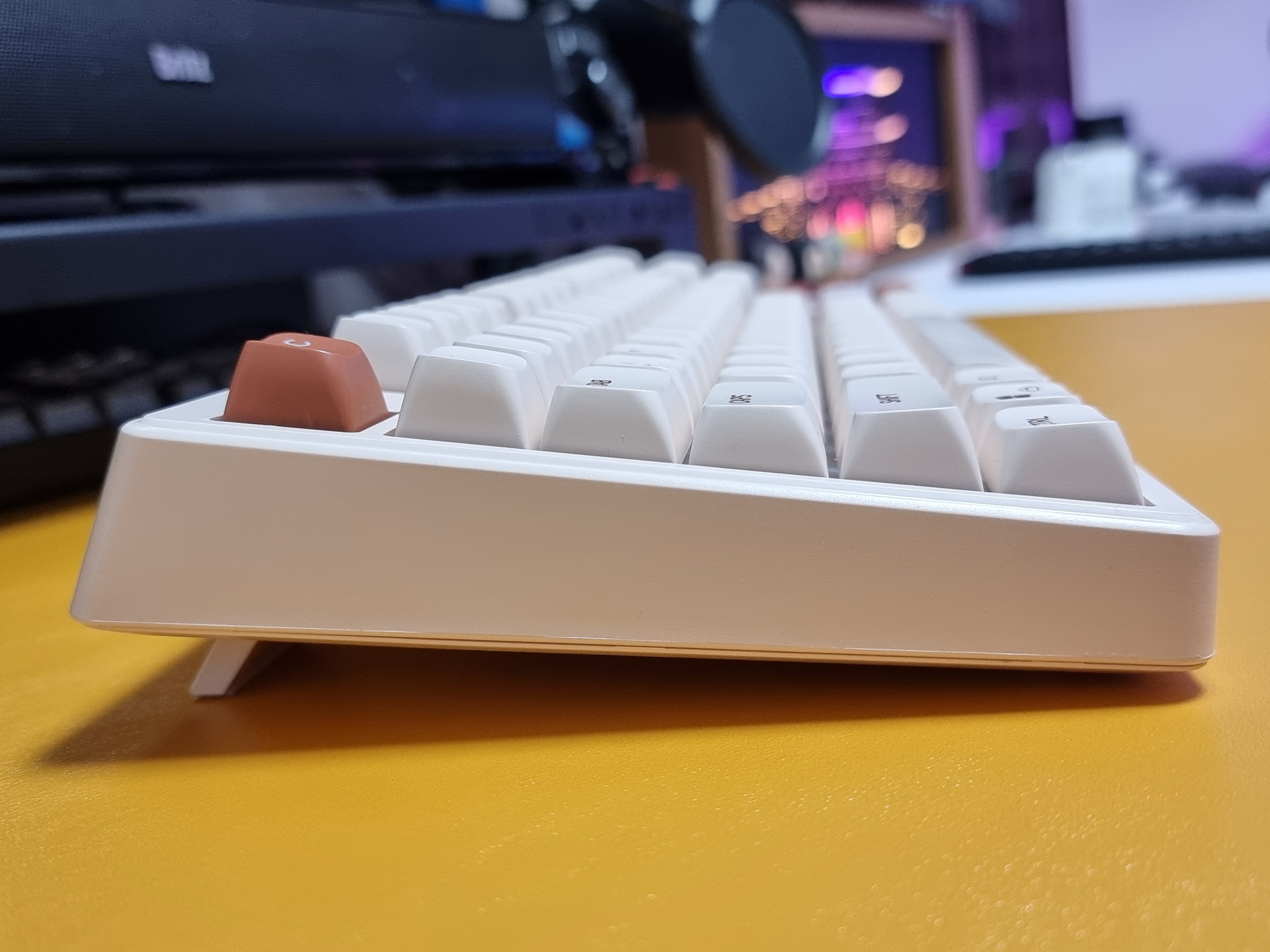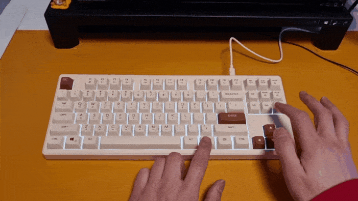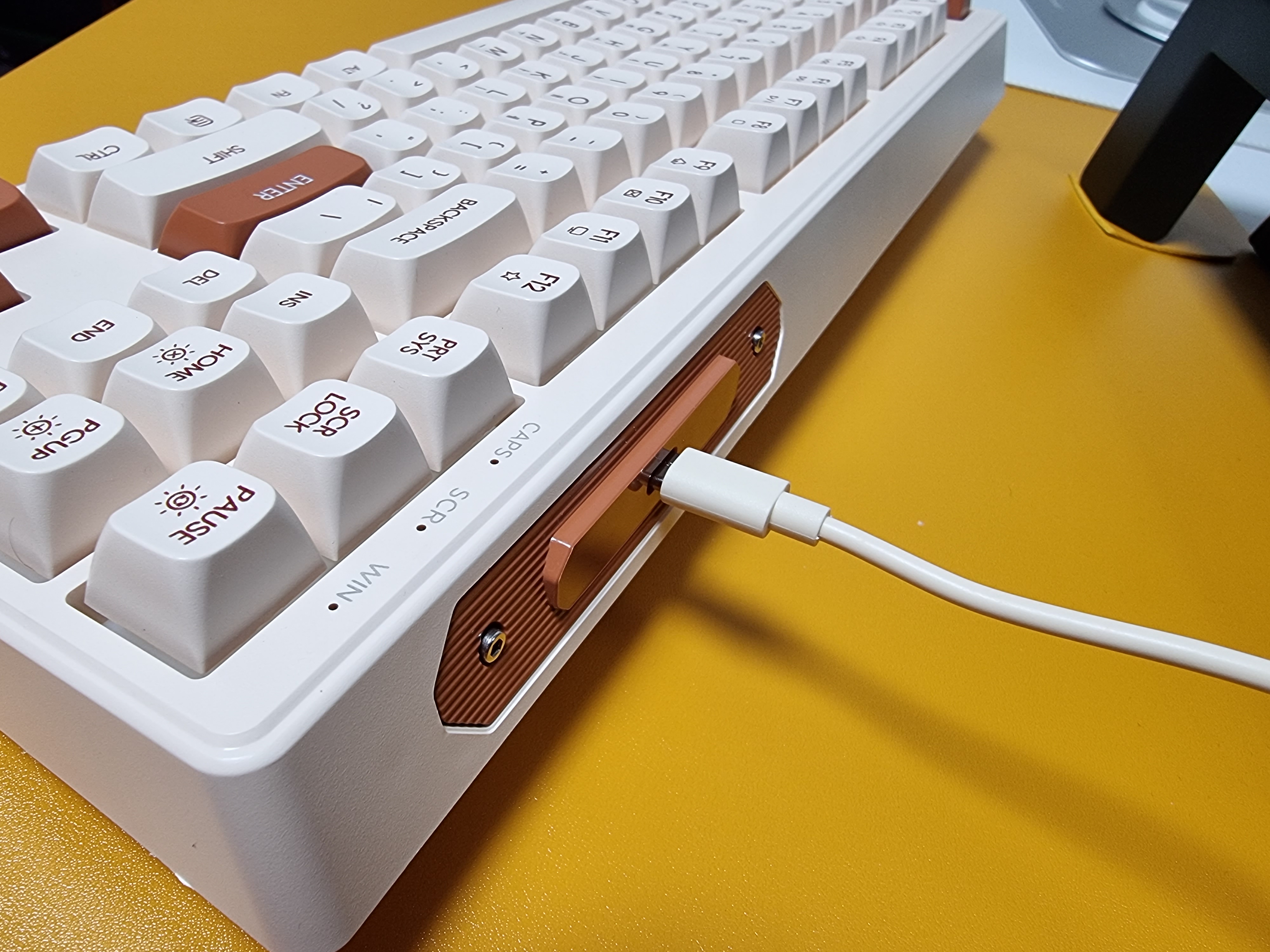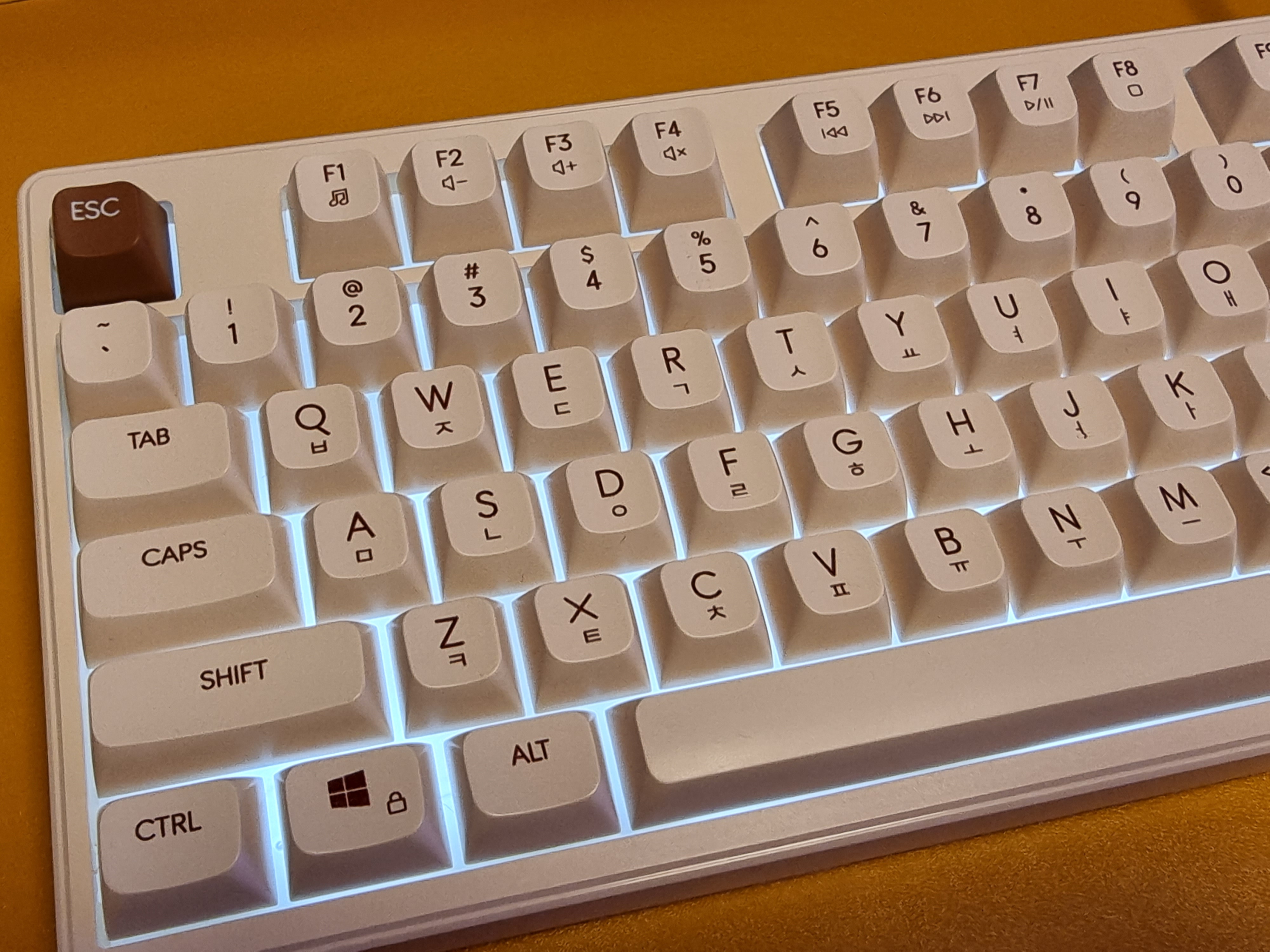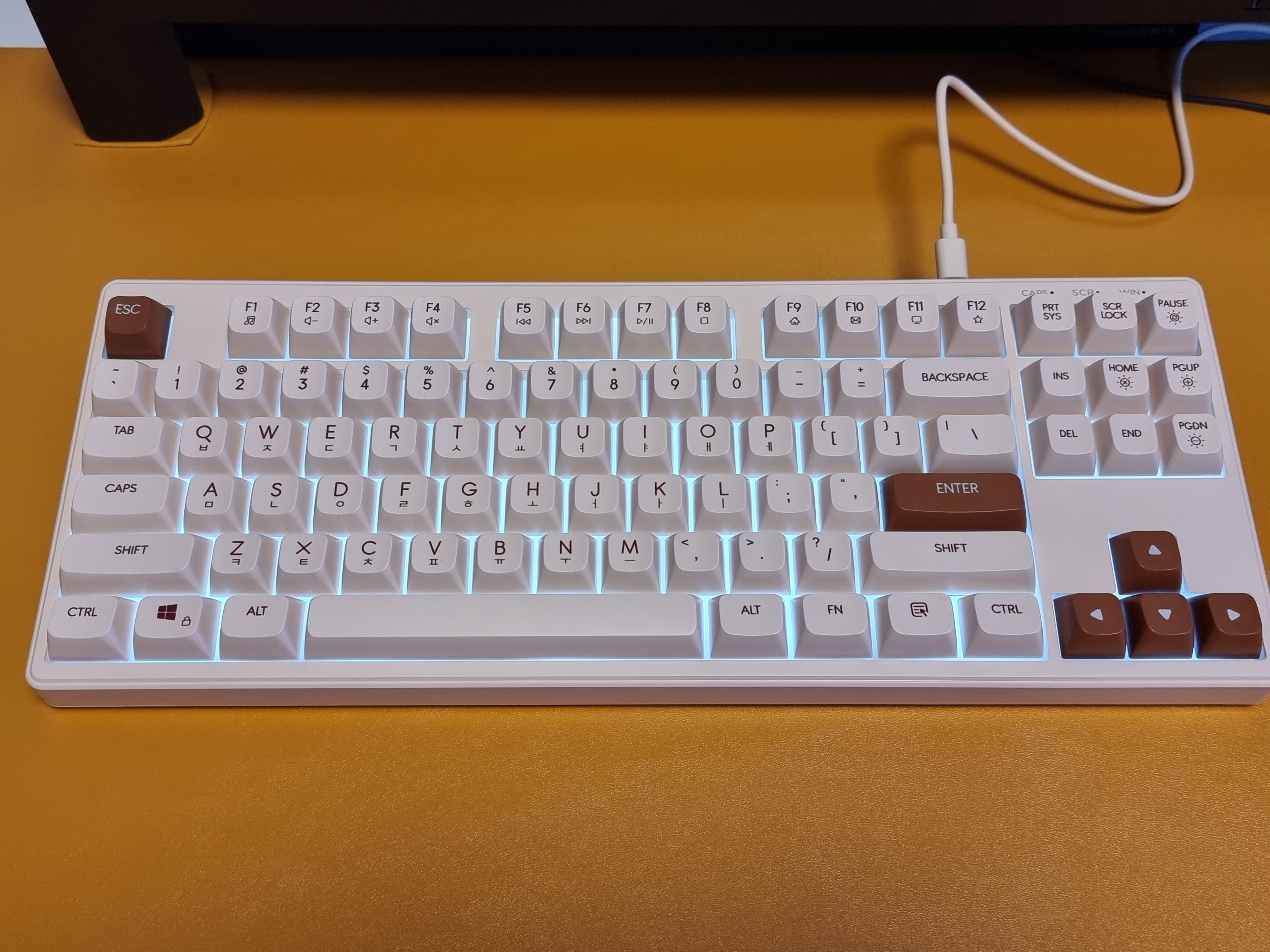 키보드에 전용 C 타입 케이블을 연결하면 LED 백라이트가 나타나며 은은한 흰색의 백라이트가 아이보리 색상과 아주 잘 어울립니다.