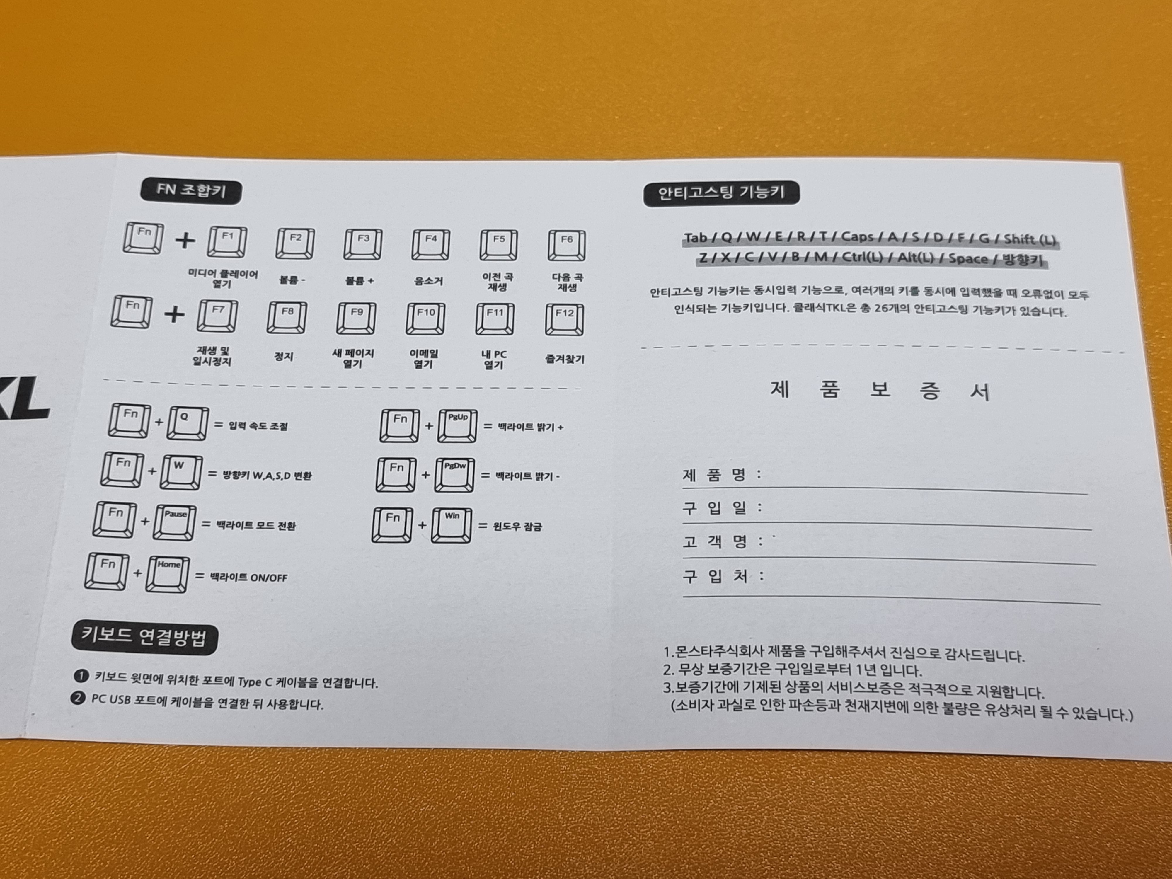 사용 설명서는 사용에 편리한 FN 키 조합 메뉴얼이 있고 게이밍 사용으로도 적합하도록 안티고스팅 기능을 안내해 주고 있습니다.