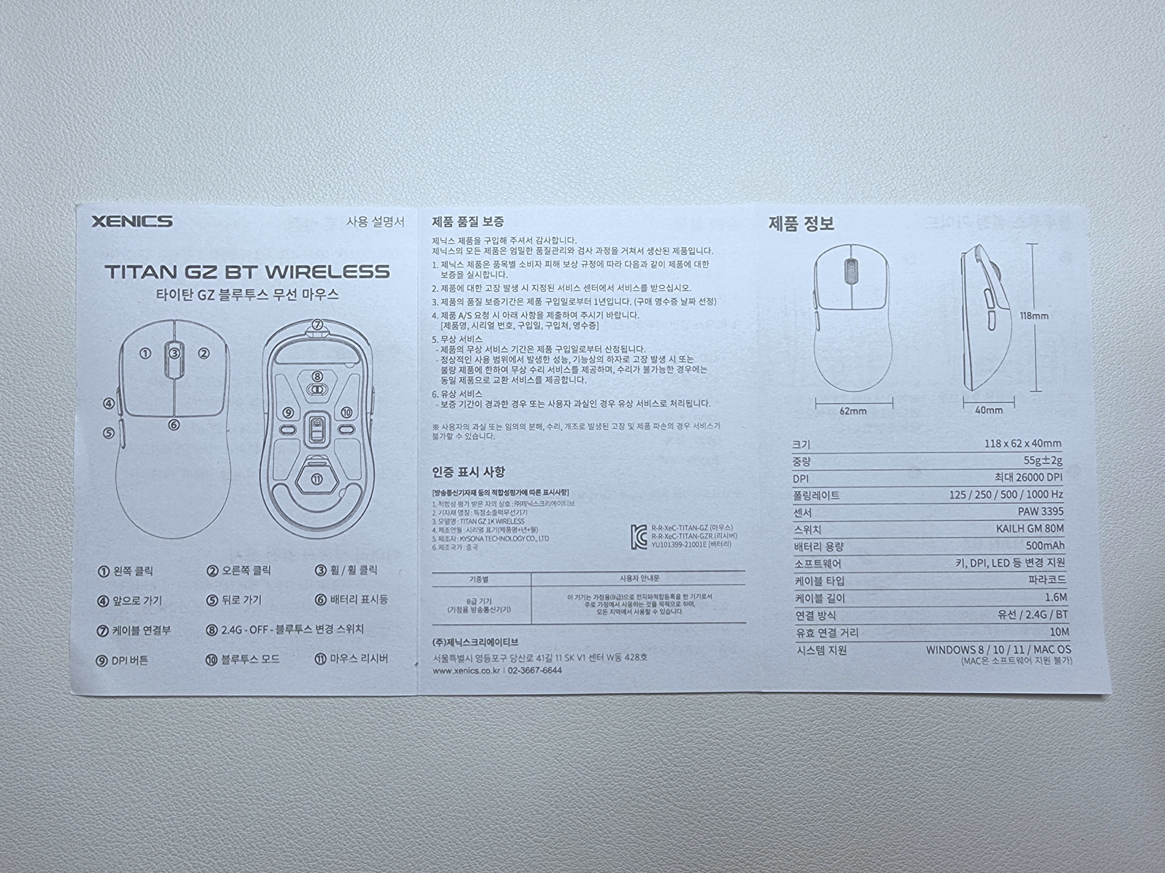 마우스의 크기는 118x62x40mm로 일반적인 마우스보다 아주 조금 작은 듯한 느낌이고 무게는 57g으로 상당히 가벼운 마우스입니다.