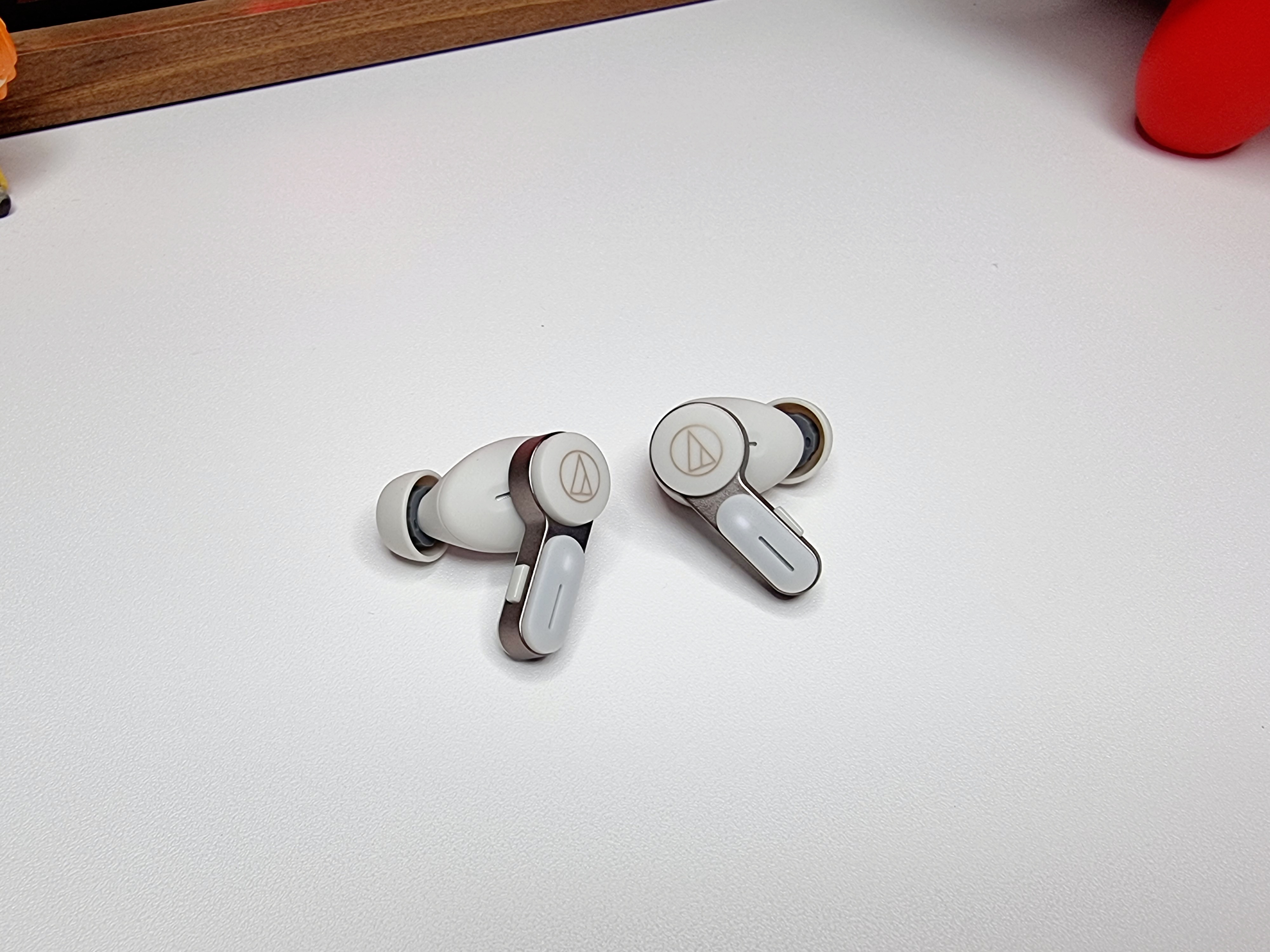 이어버드의 디자인은 스틱형이며 스템이 있는 타원형의 하우징에 물리적 버튼도 사용 가능힙니다. 그리고 타원형 중심의 오디오 테크니카 로고가 있는 부분은 터치 컨트롤이 가능합니다.