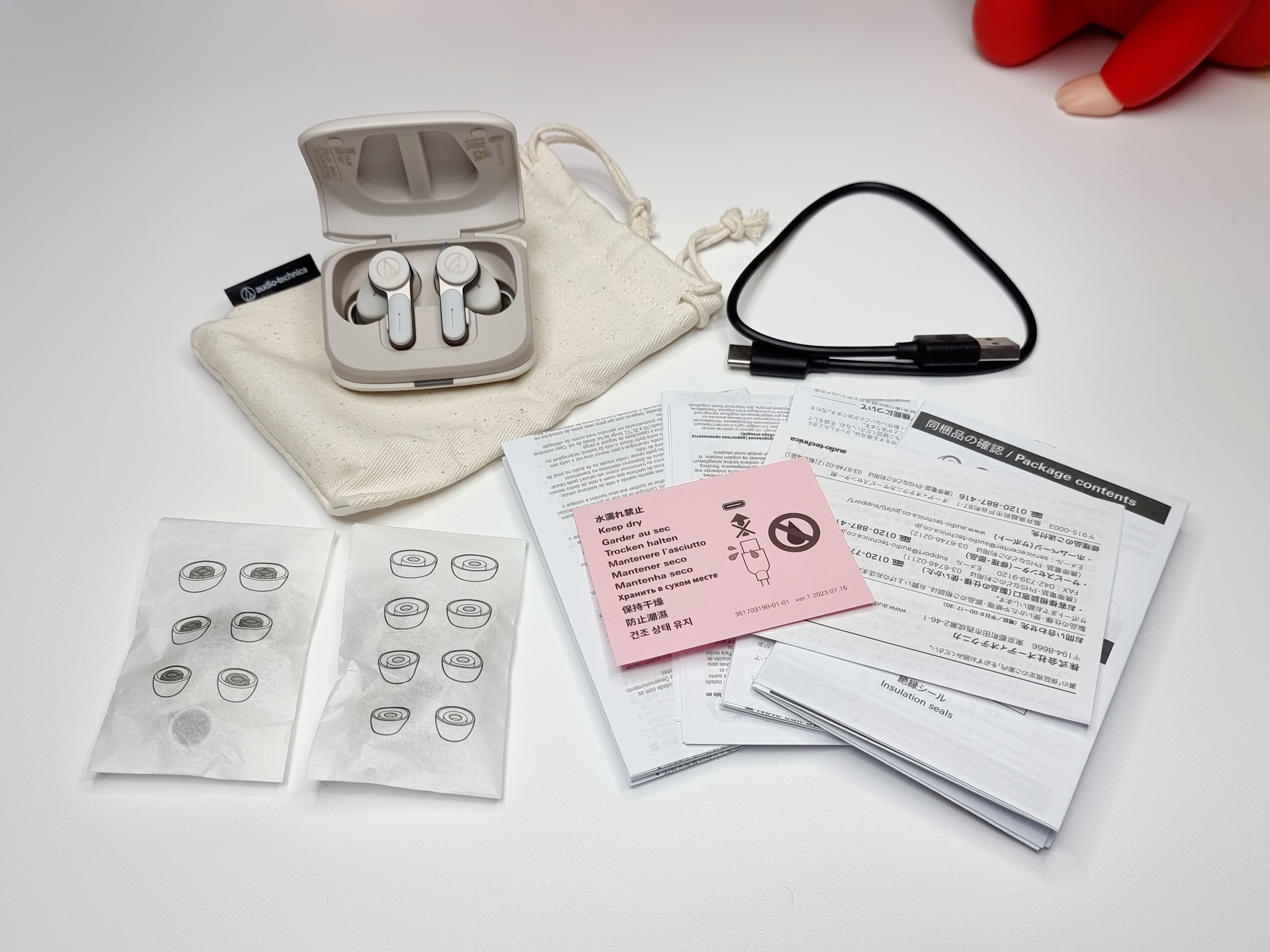 구성으로는 ATH-TWX7 충전 크래들과 이어버즈, 전용 파우치, 여분의 이어팁과 C 타입 충전 케이블, 사용 설명서 등이 있습니다.