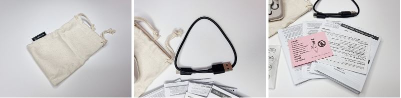 전용 파우치와 C 타입 충전케이블 그리고 사용 설명서가 있어 주의사항 및 사용 방법을 확인할 수 있어 좋았습니다.