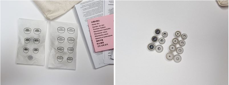 추가로 포함된 이어팁은 두 종류였습니다. 일반적인 부드러운 재질과 안쪽이 단단한 재질로 되어있는 이어팁이 있어 사용자의 편의에 맞게 선택하여 사용이 가능합니다.