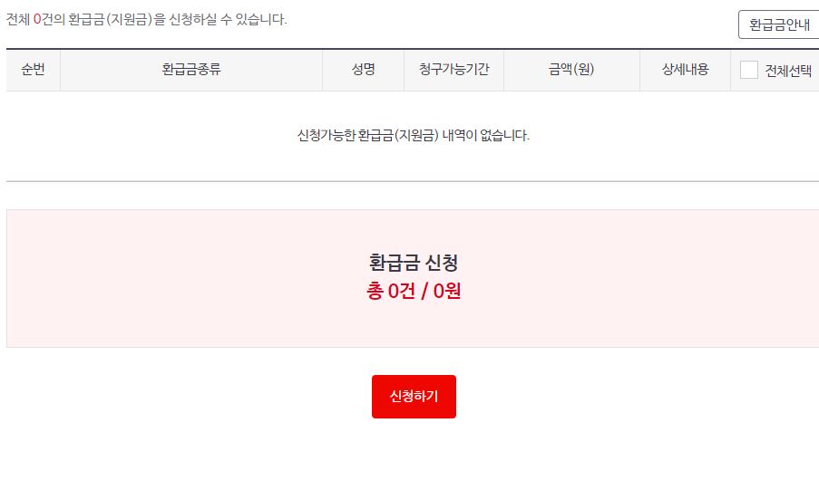 신청가능한 환급금이 있다면 선택하여 신청하기 버튼을 누르면 됩니다.