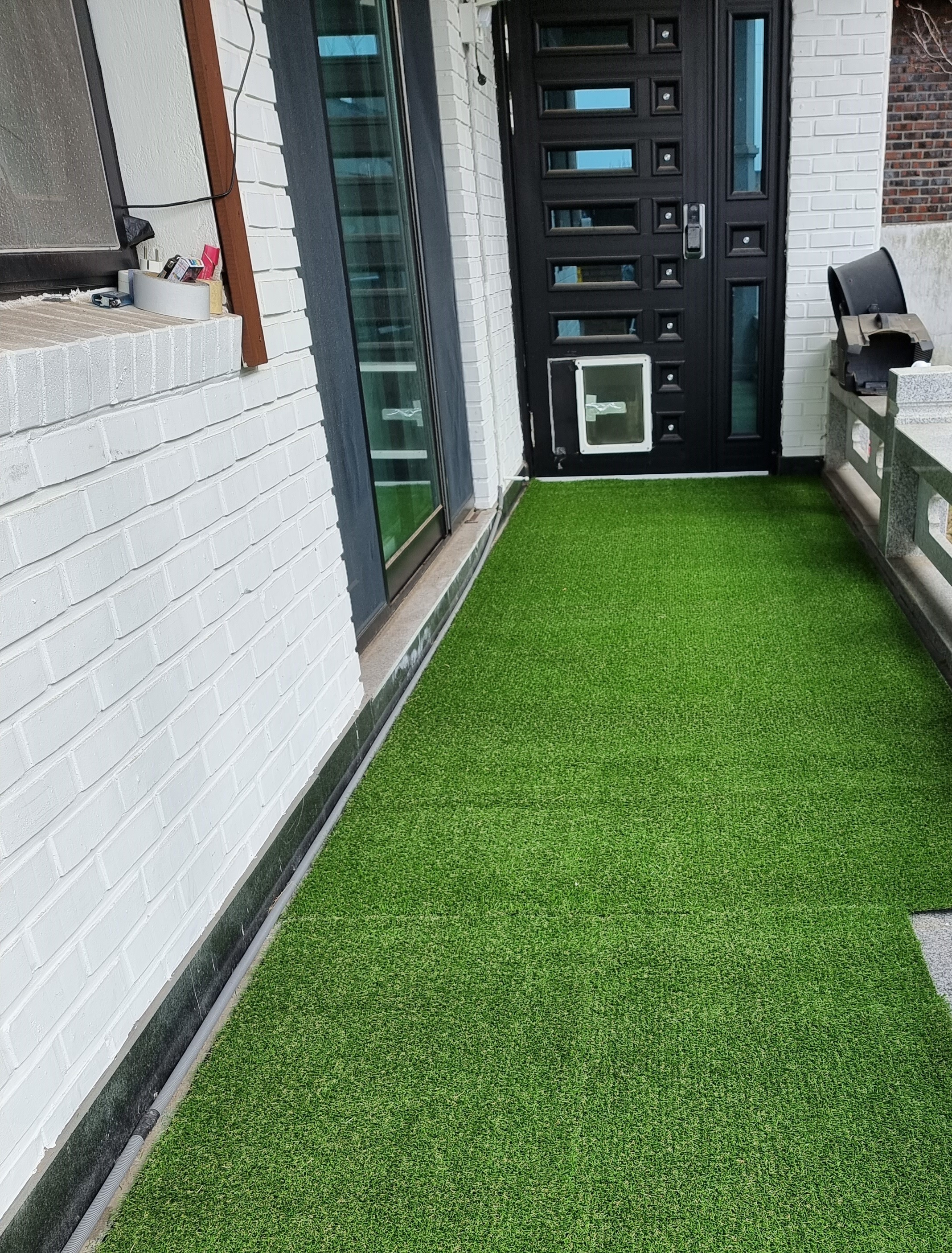 현관 입구를 새롭게 꾸미고 싶은 마음에, 드디어 오랫동안 기다려온 인조잔디 시공을 진행했습니다. 강아지가 뛰어다닐 때 미끄러워 관절에 좋지 않을 것 같아, 안전하고 깔끔한 인조잔디로 변신시키기로 결정했어요.