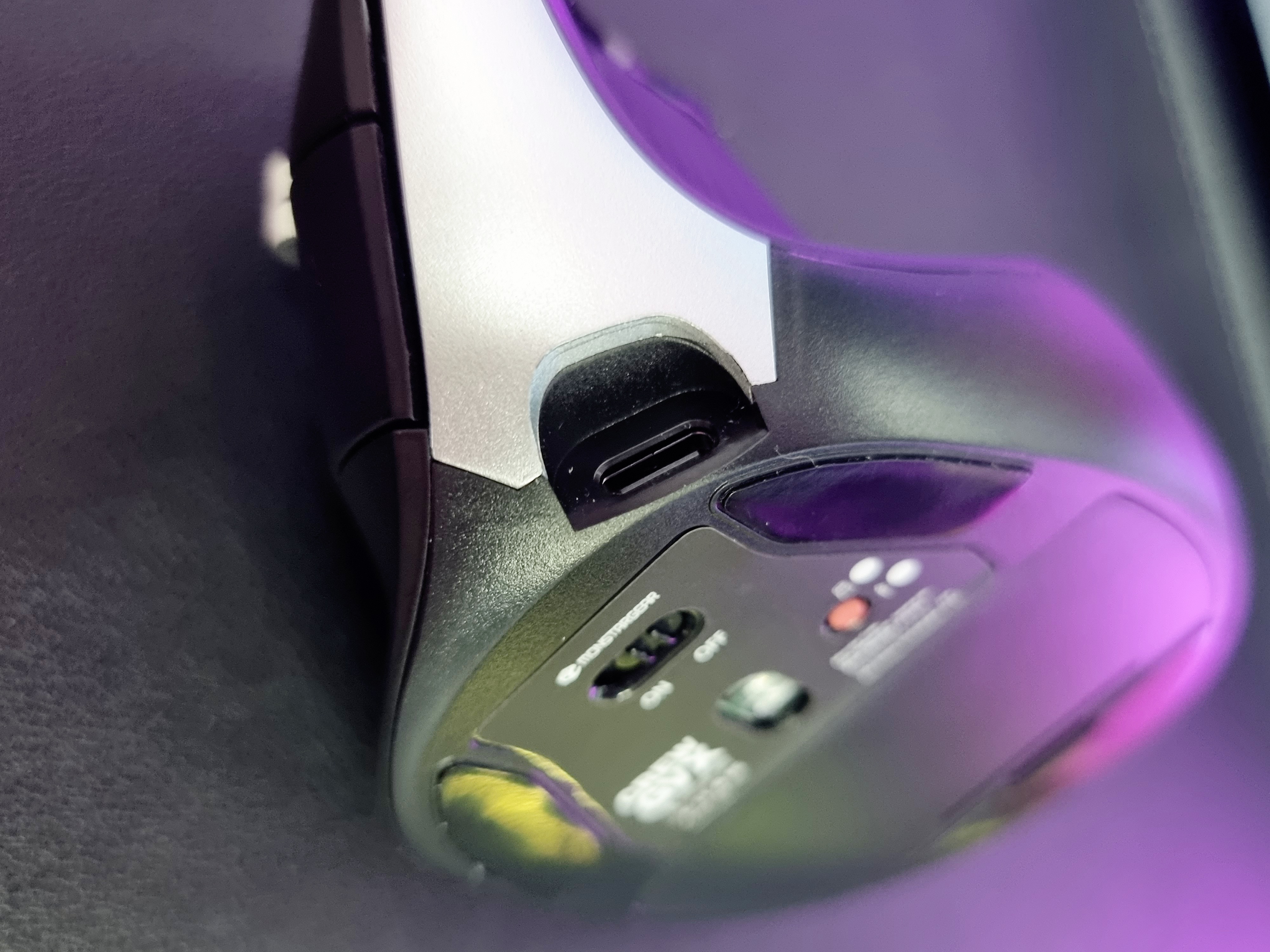바닥에는 테프론 피트가 3개 부착되어 있고 전원 버튼과 USB/블루투스 변환이 가능한 스위치가 있습니다.