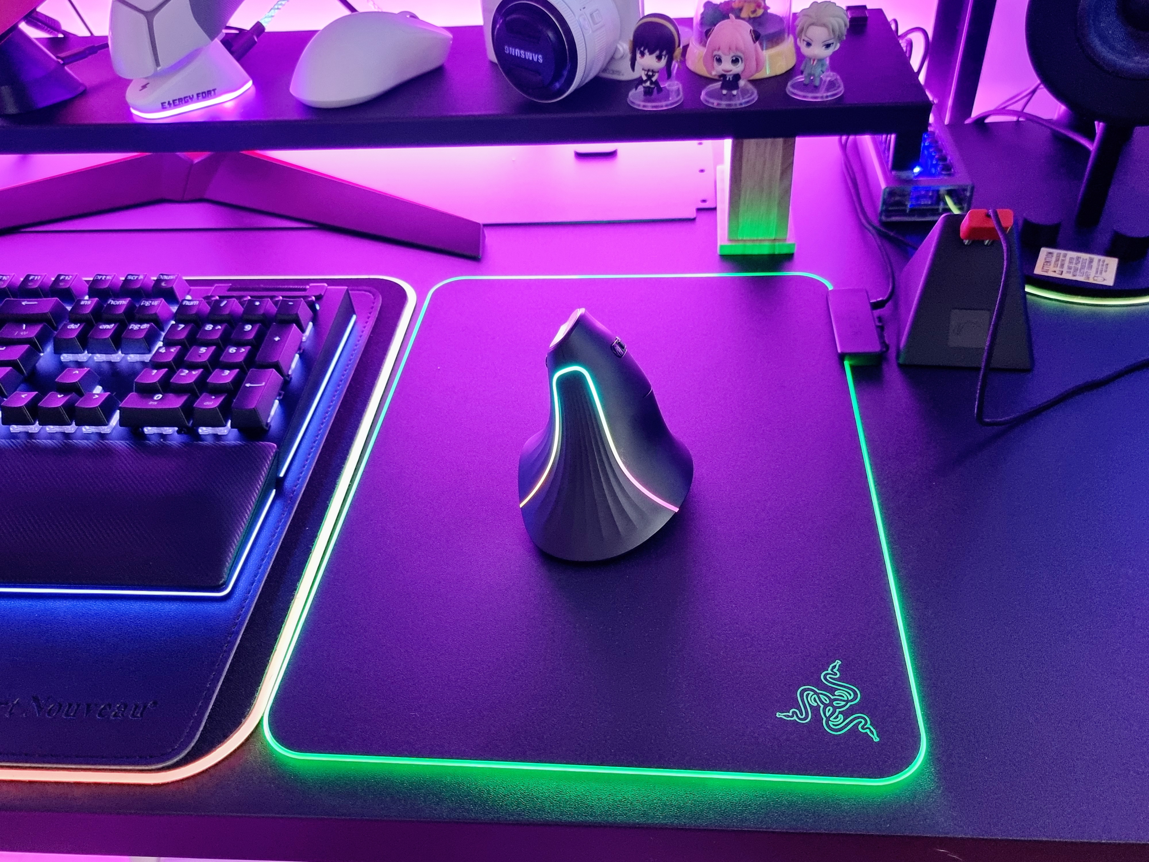 뒤에 보이는 RGB 조명과 빗살 무늬 디자인은 버티컬마우스의 세련미를 더해주고 있는 것 같습니다.