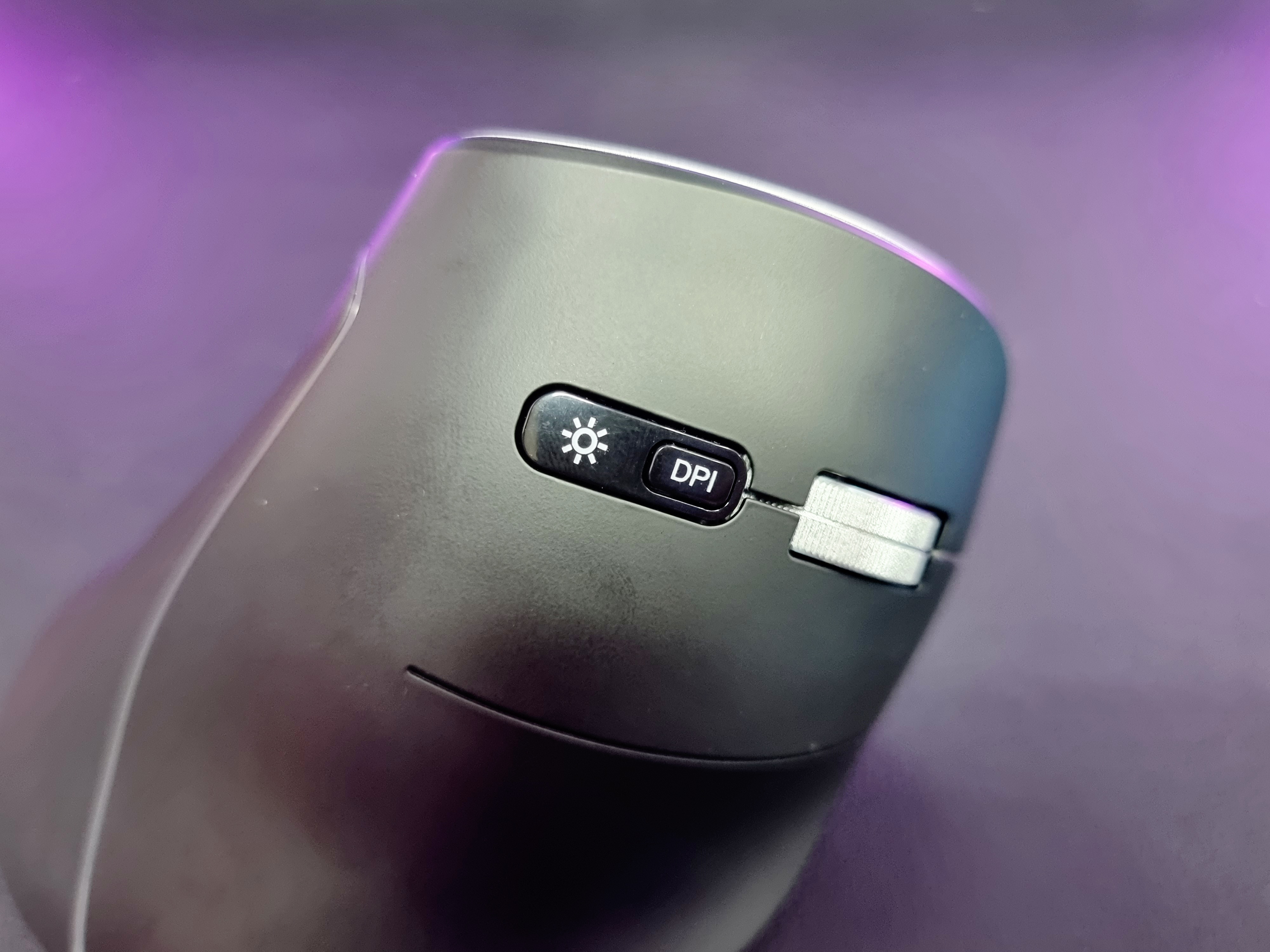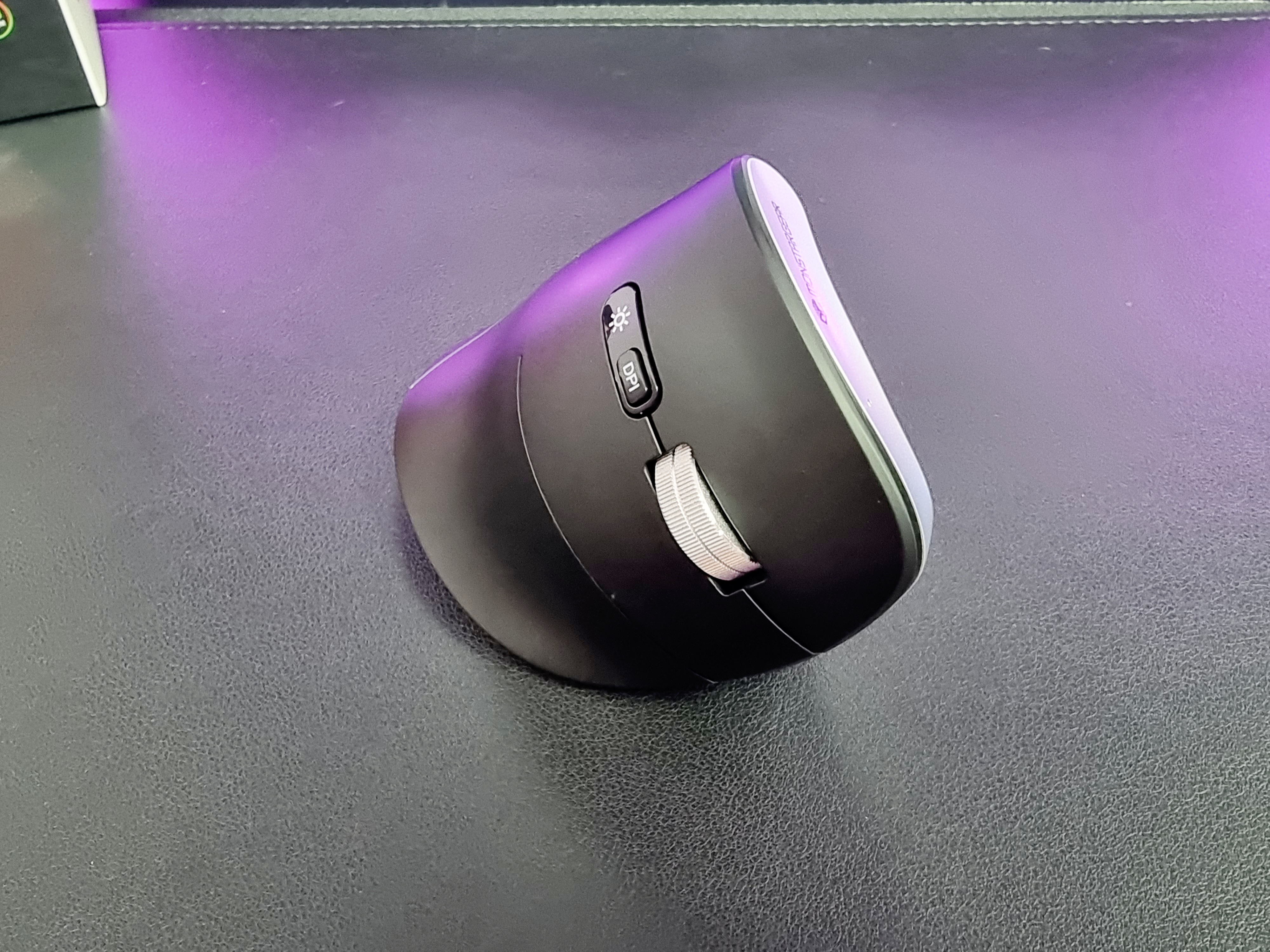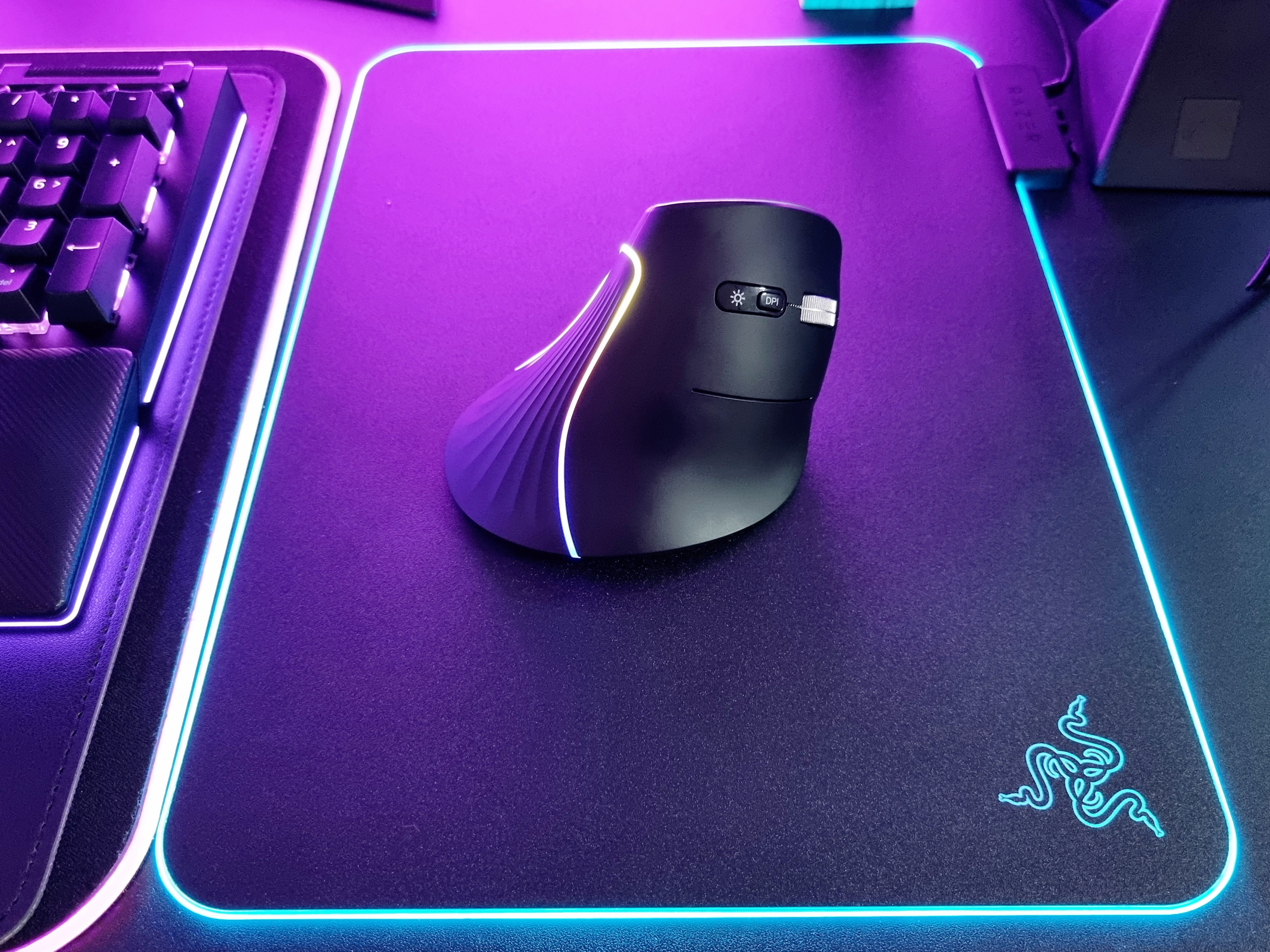 뒤에 보이는 RGB 조명과 빗살 무늬 디자인은 버티컬마우스의 세련미를 더해주고 있는 것 같습니다.