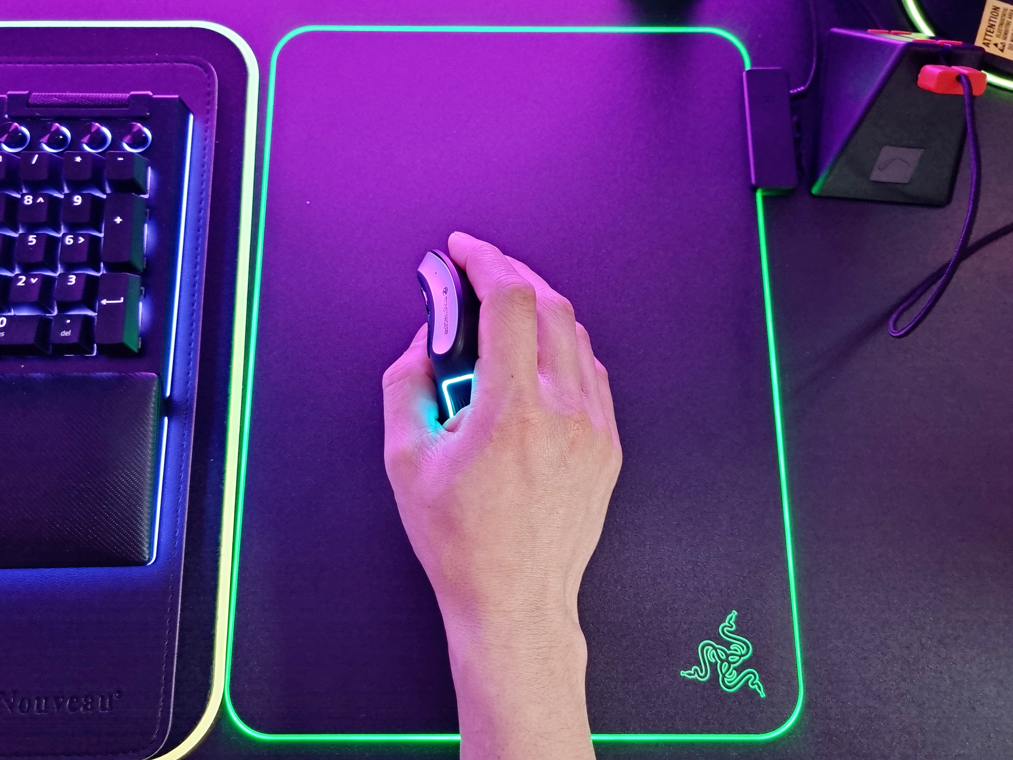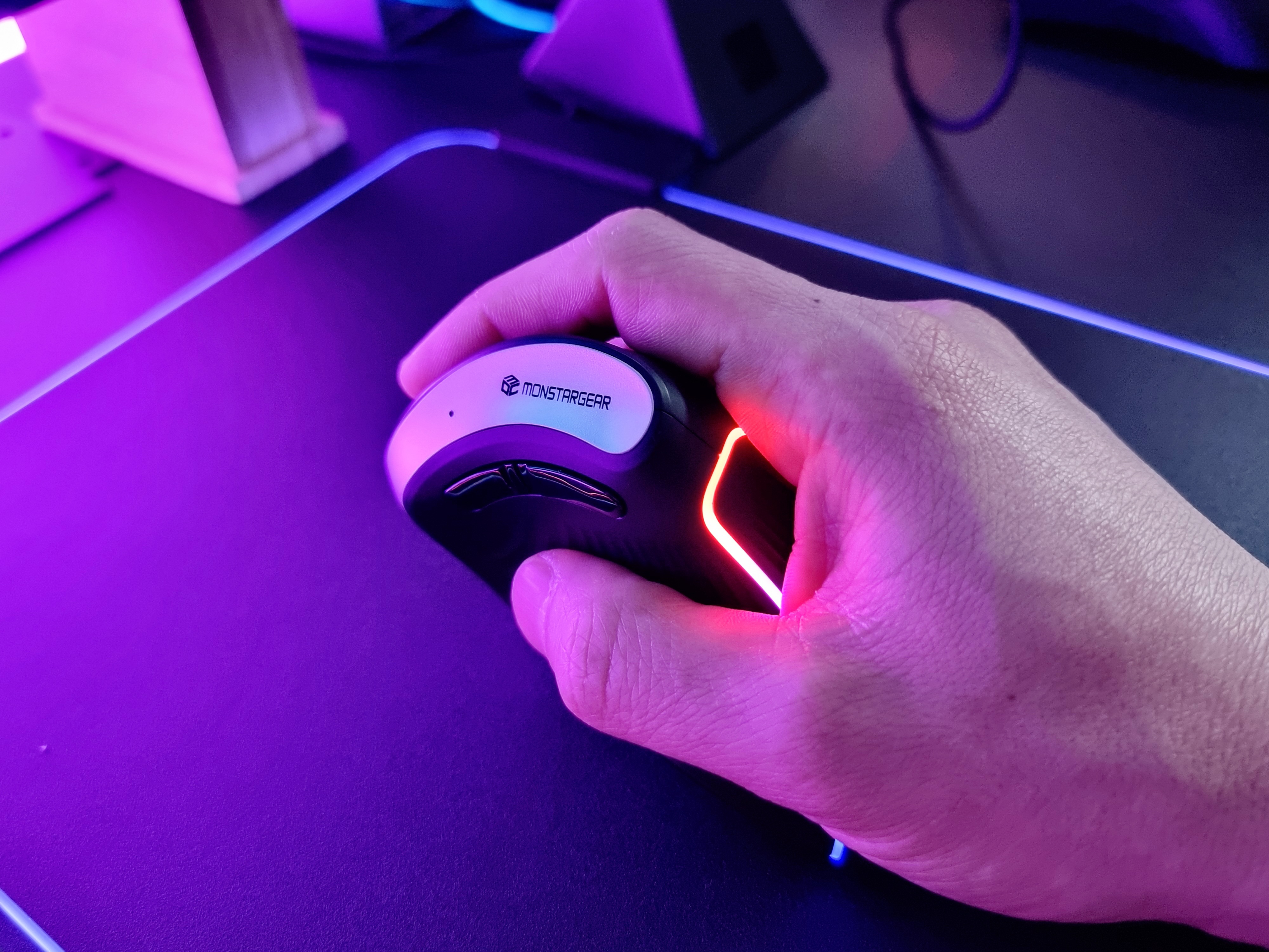 몬스타기어 크루 GVX의 전원을 켜보면 RGB 조명을 볼 수 있고 광량도 좋아 밝은 환경에서도 예쁜 RGB 감성을 느낄 수 있습니다.