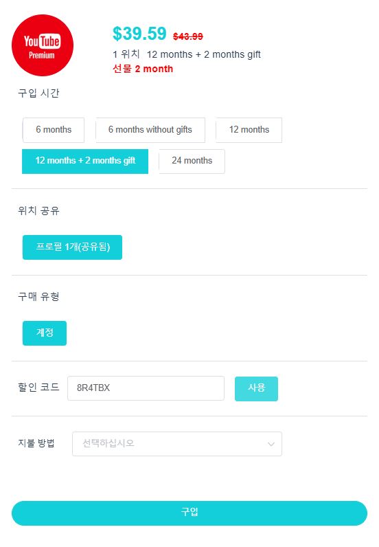 하지만 Nfxbus 사이트를 이용하면 12개월 + 2개월 총 14개월 구독권을 $39.59로 유튜브 프리미엄을 이용할 수 있습니다. 이는 한화로 약 57,000원에 해당하며, 정가보다 훨씬 저렴합니다. 위와 같이 할인 코드를 적용하면 추가로 10% 할인 혜택도 받을 수 있어 6개월 구독권 기준 약 $14 추가하여 사용이 가능합니다.