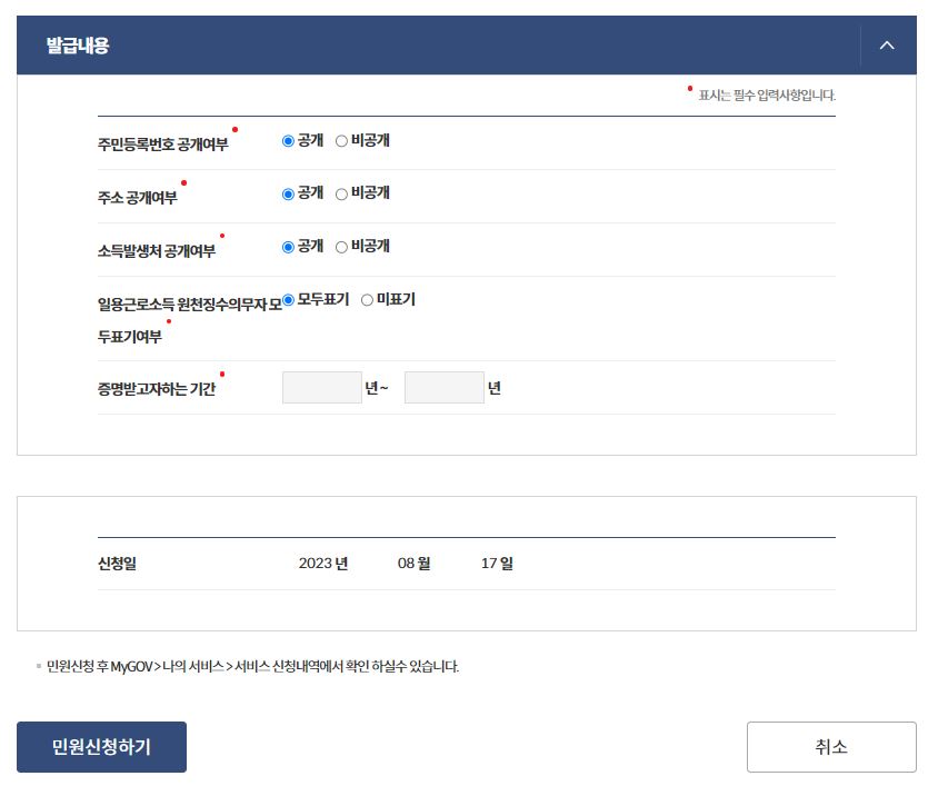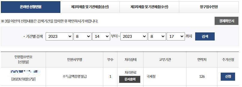 민원신청하기를 클릭하면 소득금액증명발급이 바로 처리됩니다.