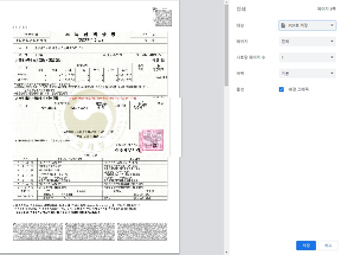 우측상단 PDF로 저장으로 선택하시고 '저장'을 클릭합니다.