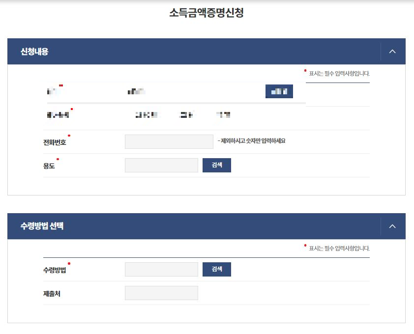 전화번호, 용도, 수령방법, 제출처를 기입합니다.