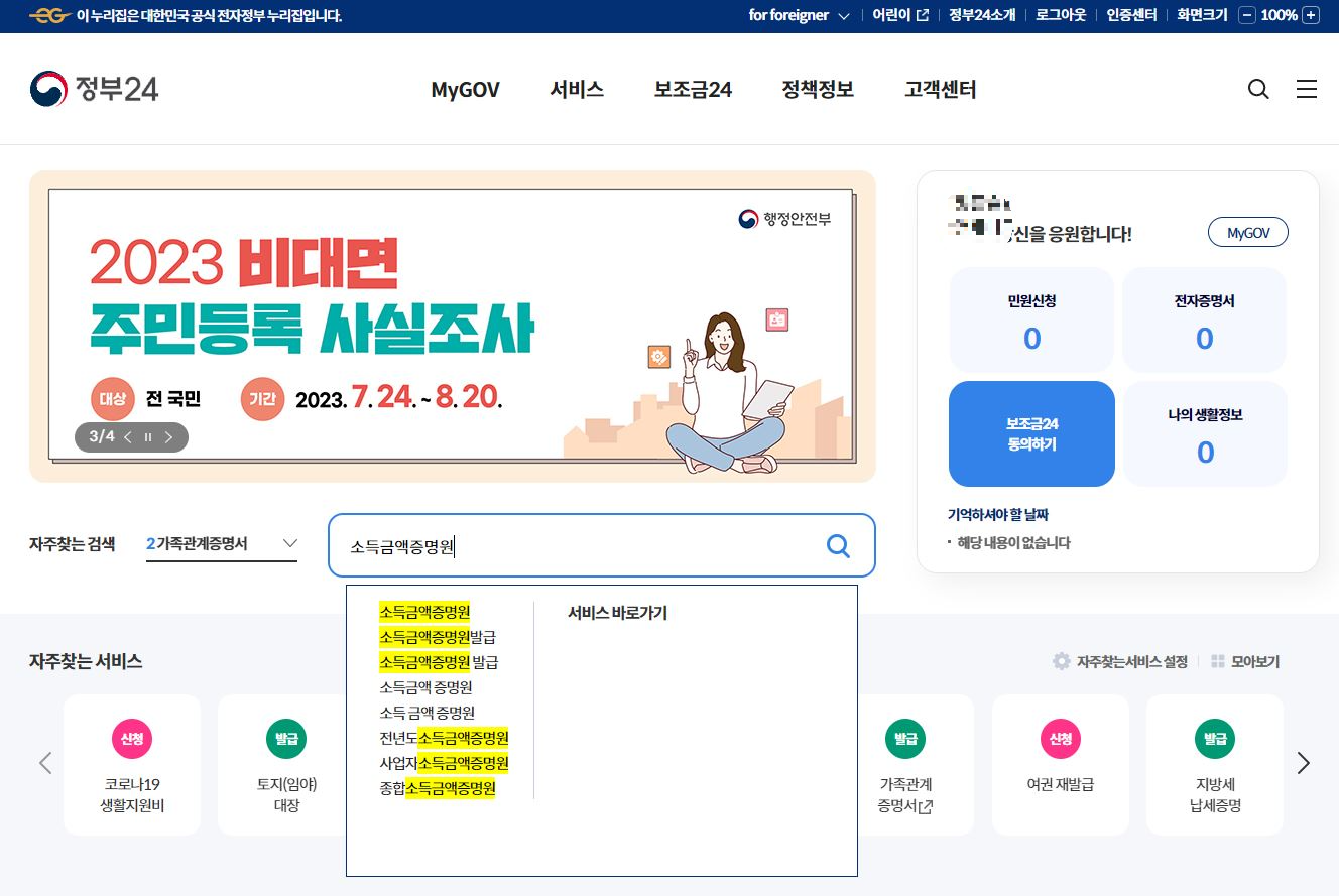 정부24 사이트에 접속하여서 로그인하시고, 차주 찾는 검색에 소득금액증명을 검색합니다.