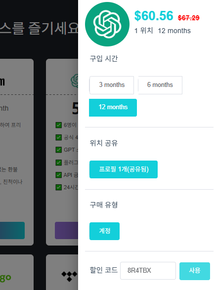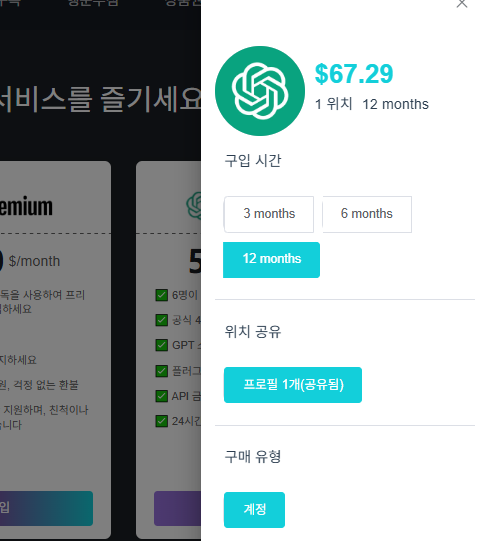 조금 더 자세히 설명하자면, 메뉴에서 GPT Plus 항목 → ‘구입’ 클릭 → 구매 옵션 선택 순서로 진행됩니다. 3개월, 6개월, 12개월 단위로 구독할 수 있으며, 가격도 미리 확인 가능합니다.