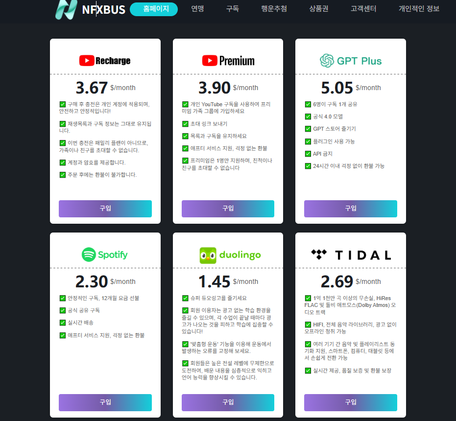 제가 자주 이용하는 곳은 NFTBUS라는 사이트인데요. 여기서 유튜브 프리미엄은 물론, 챗GPT, GPT5도 저렴하게 결제해 사용하고 있어요.