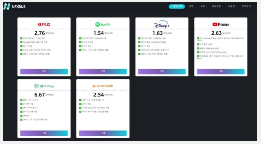 제가 주로 이용하는 사이트는 NFTBUS인데요, 여기서 유튜브 프리미엄도 저렴하게 구독하고, 추가로 챗GPT 4.0도 결제해서 사용하고 있어요.