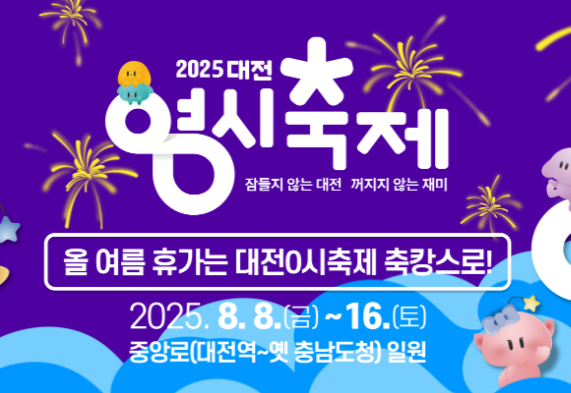 • 기간: 2025년 8월 8일(금) ~ 8월 16일(토), 9일간. 메인 운영 시간은 오후부터 자정(약 14:00~24:00)까지로 공지됐습니다. 장소는 대전역 ~ 옛 충남도청 구간(중앙로·원도심 일원)입니다.