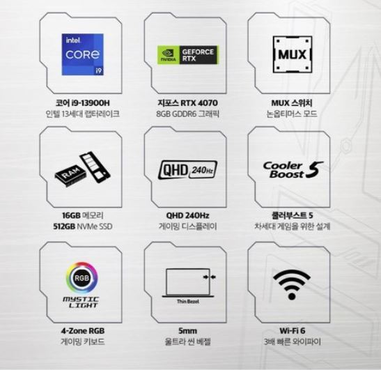 또한, 이 모델의 디스플레이는 17인치 (43.9cm) 크기로, 해상도는 2560x1440(QHD)입니다. IPS 안티 글래어 패널을 사용하고 있어, 눈의 피로감을 줄여줍니다. 또한, 240Hz의 고주사율을 지원해 원활한 게임 플레이를 제공합니다.